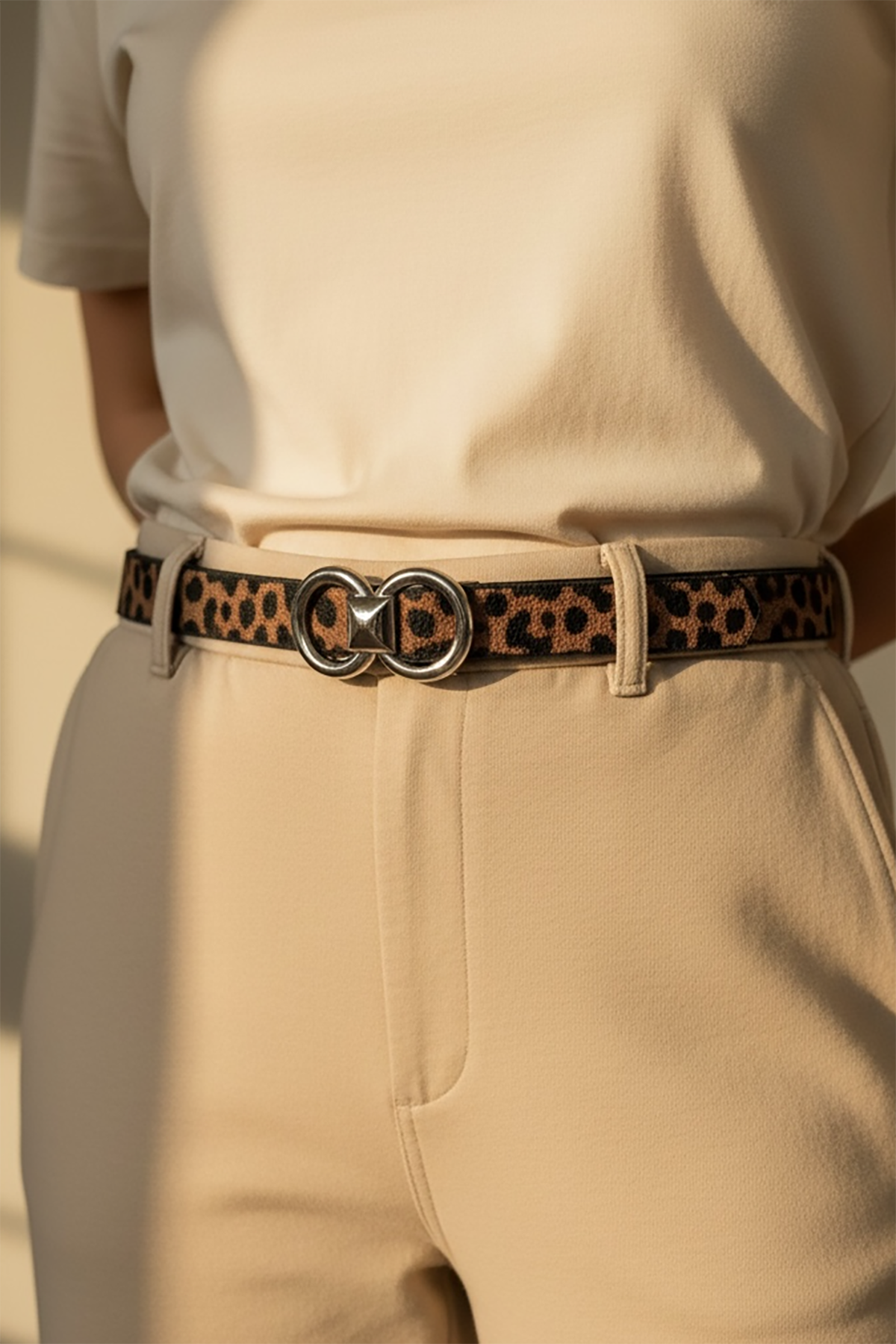 Gümüş Renk Leopar Desenli Kadın Deri Kemer