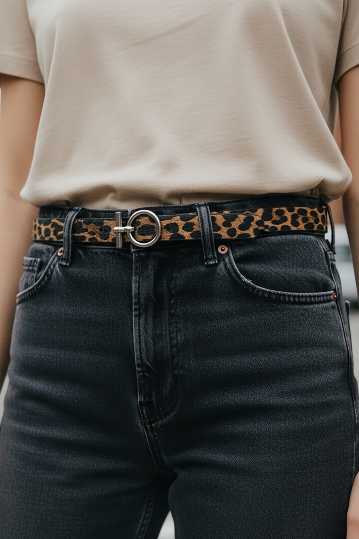 Gümüş Renk Leopar Desenli Kadın Deri Kemer