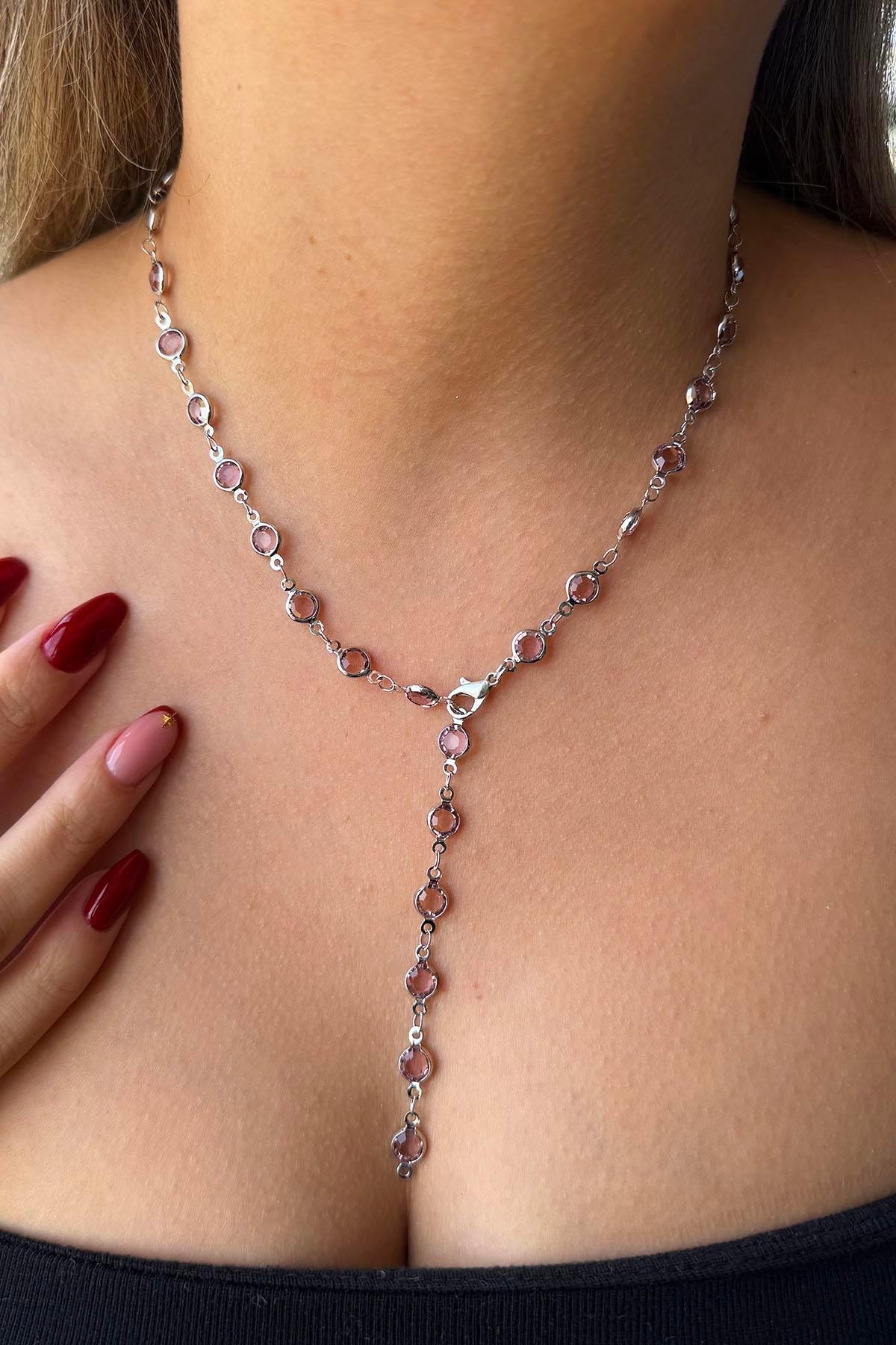 Gümüş Renk Pembe Taş Detaylı Çelik Y Kolye