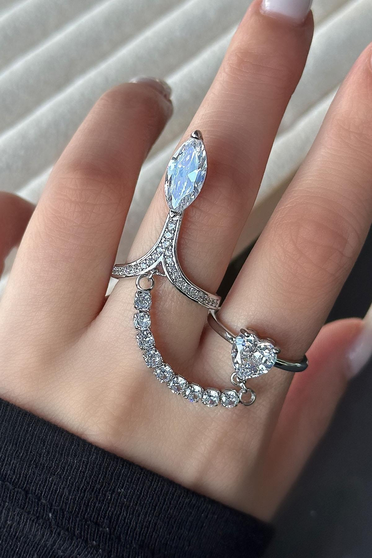 Gümüş Renk Taş Detaylı Ayarlanabilir İkili Çelik Yüzük