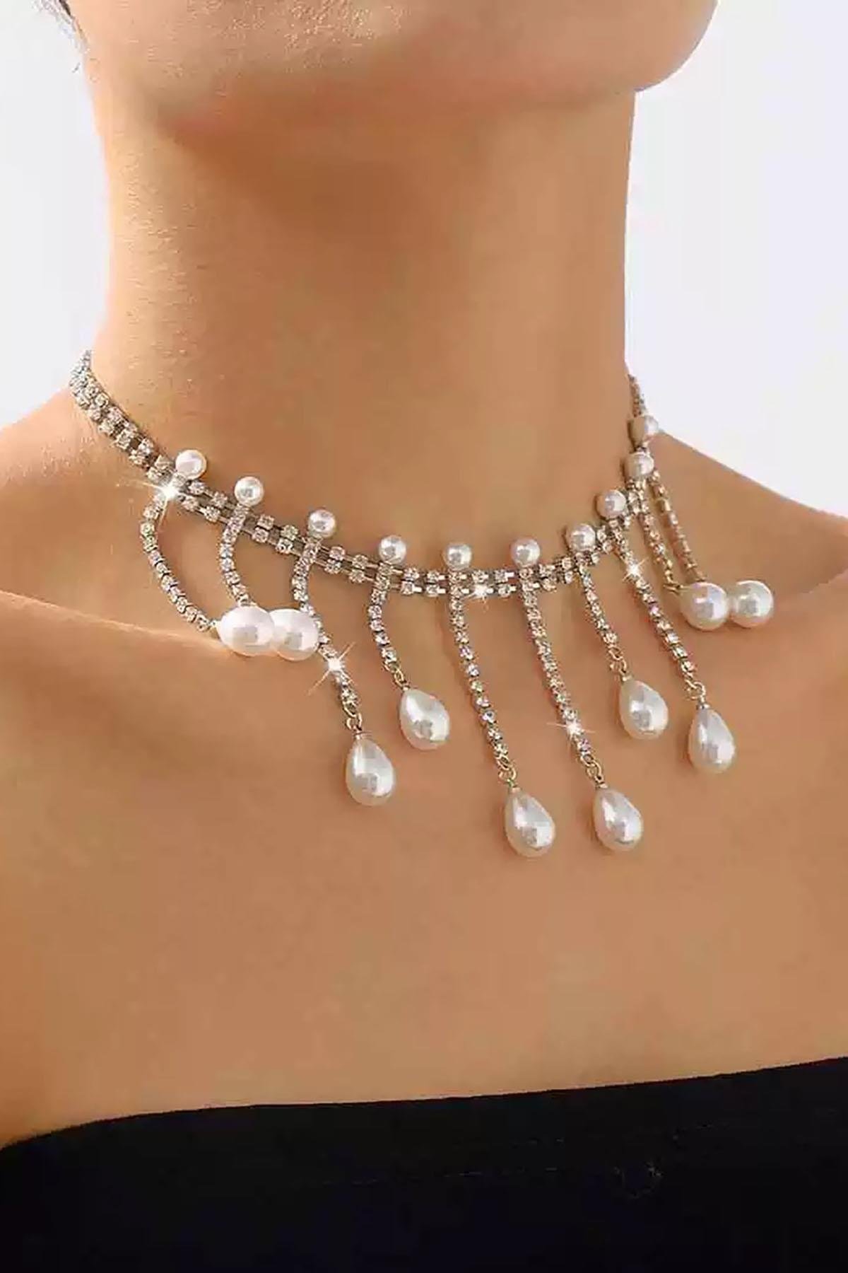 Gümüş Renk Taş Ve İnci Detaylı Tasarım Abiye Kolye