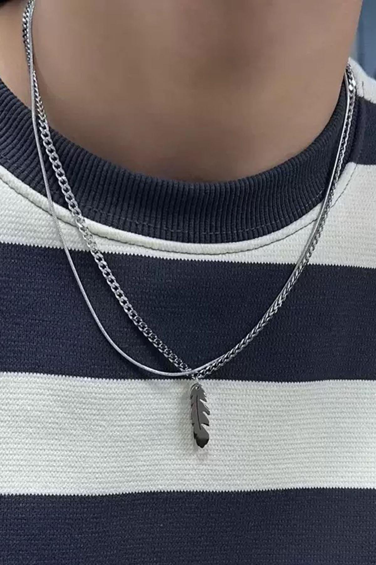 Gümüş Renk Tüy Figürlü Erkek İkili Zincir Çelik Kolye
