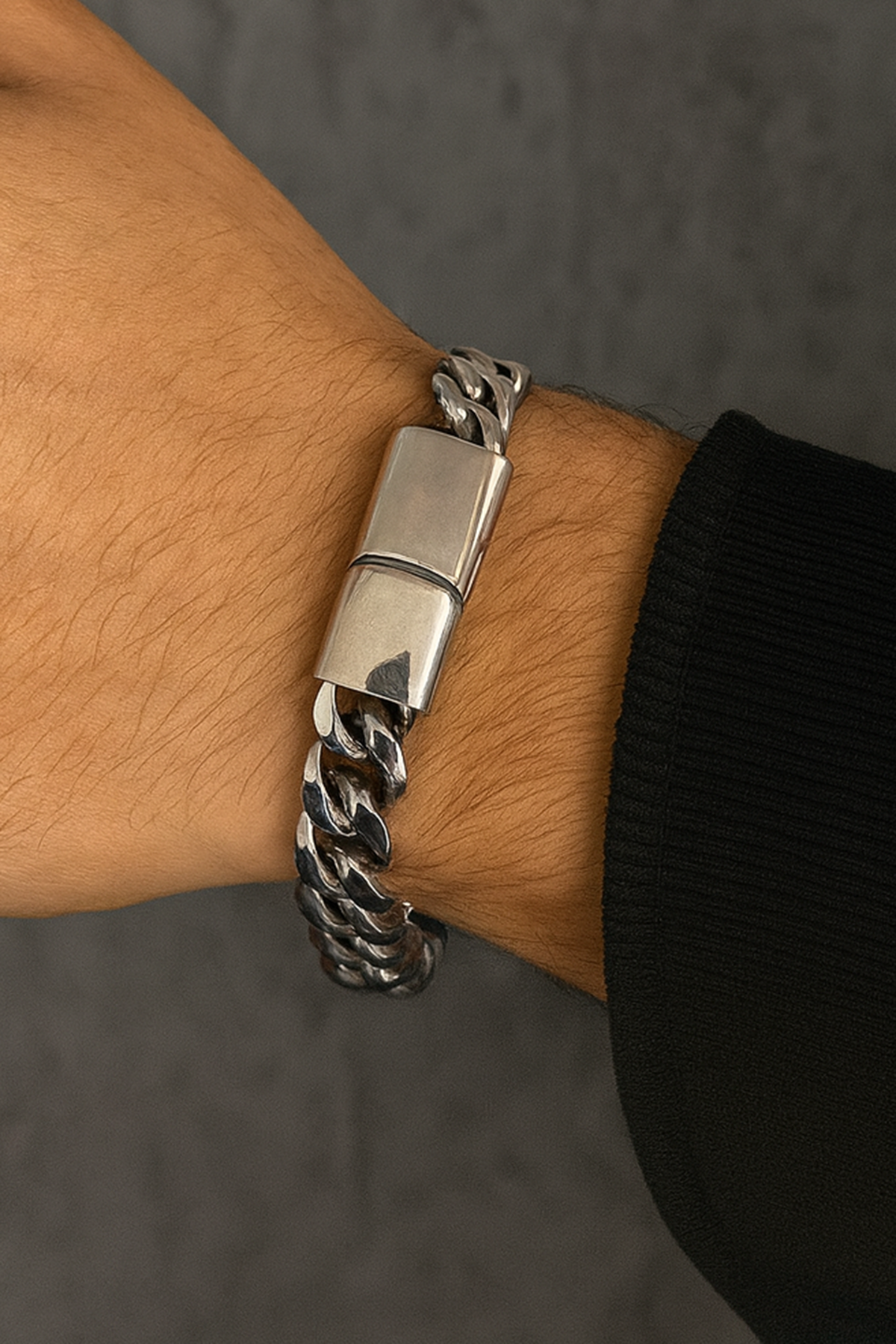 Gümüş Renk Zincir Detaylı Çelik Erkek Bileklik