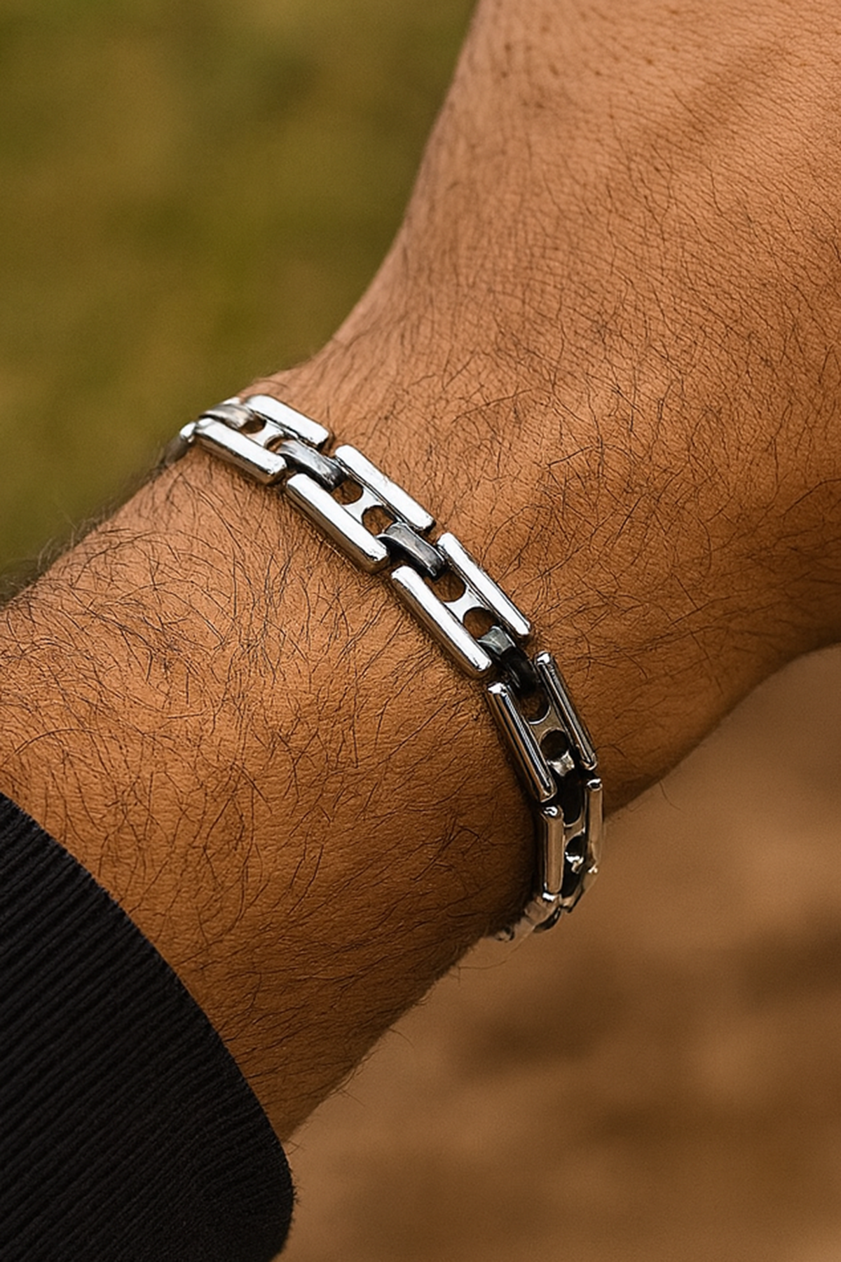 Gümüş Ve Siyah Renk Zincir Detaylı Çelik Erkek Bileklik
