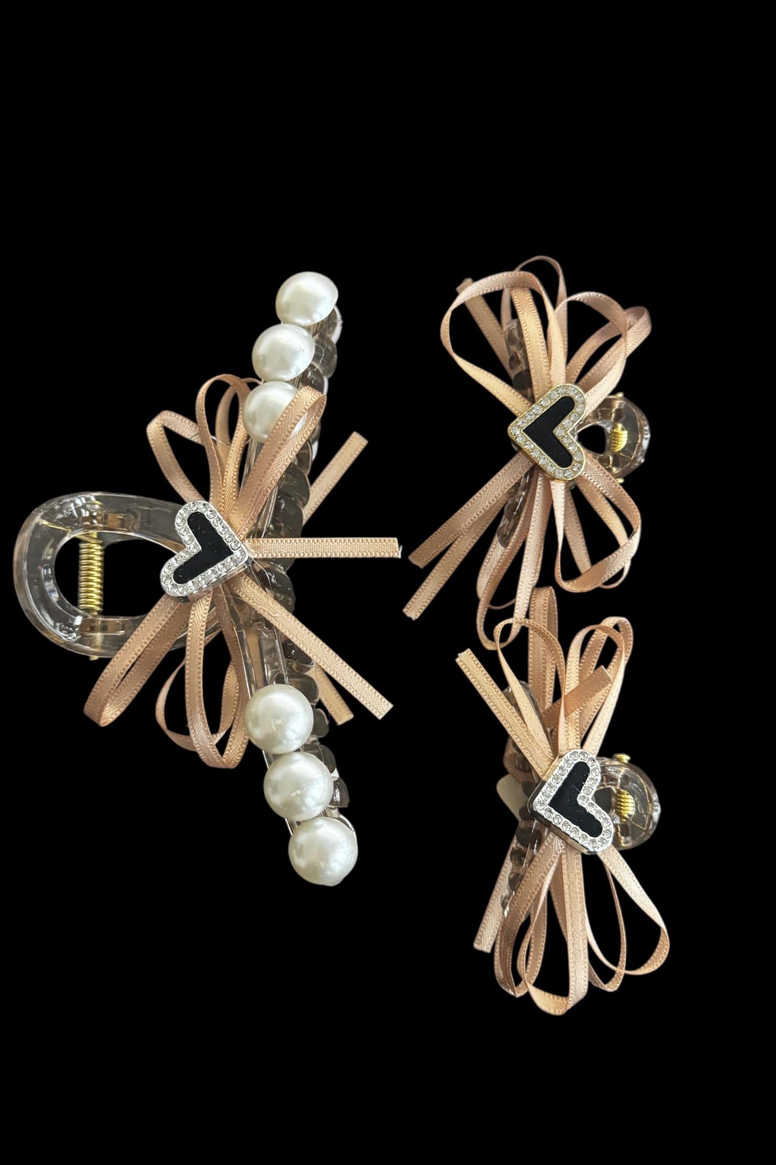 Kahverengi Kalp Figürlü İnci Detaylı 3'lü Mandal Toka Set