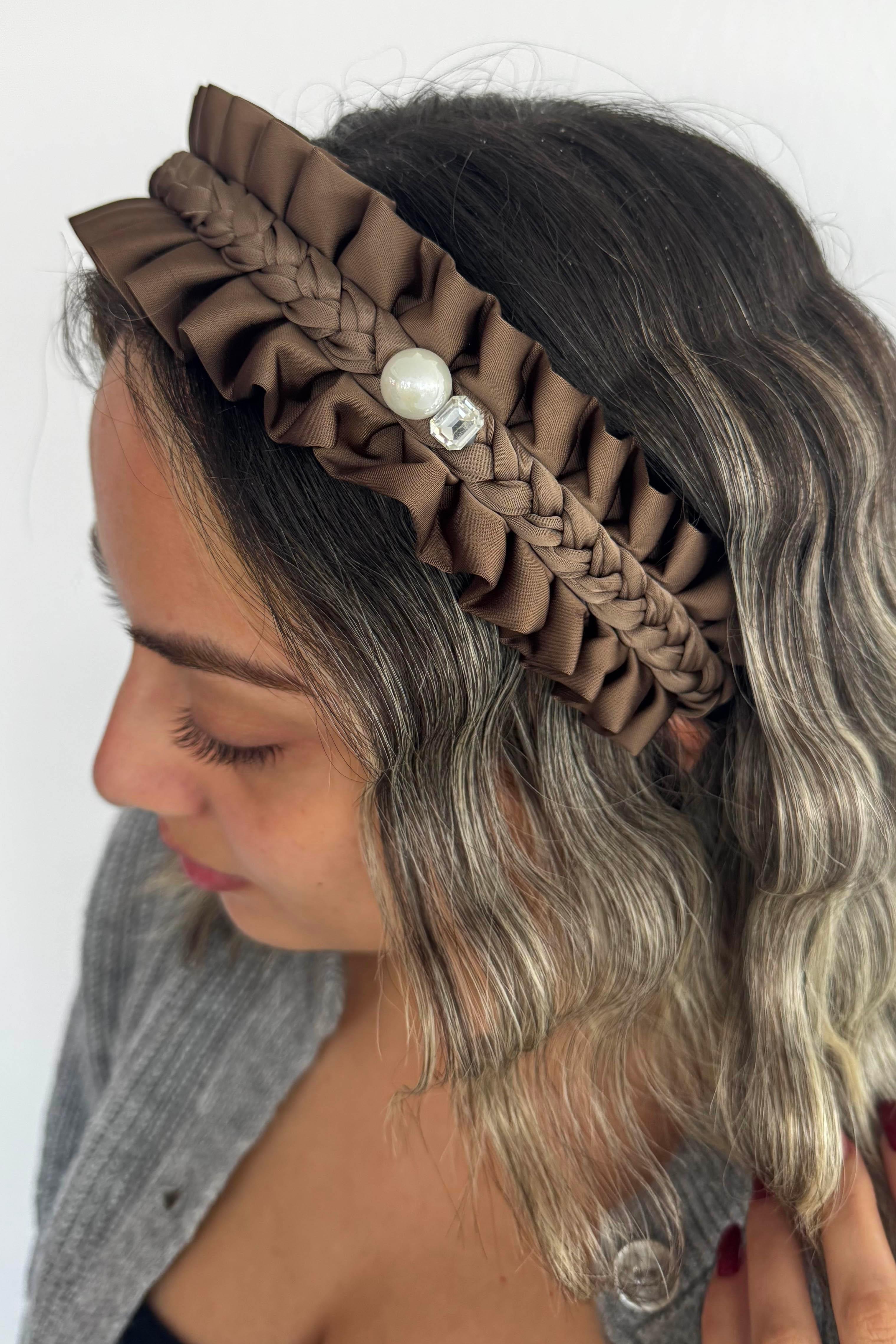 Kahverengi Taş Detaylı Büzgülü Taç