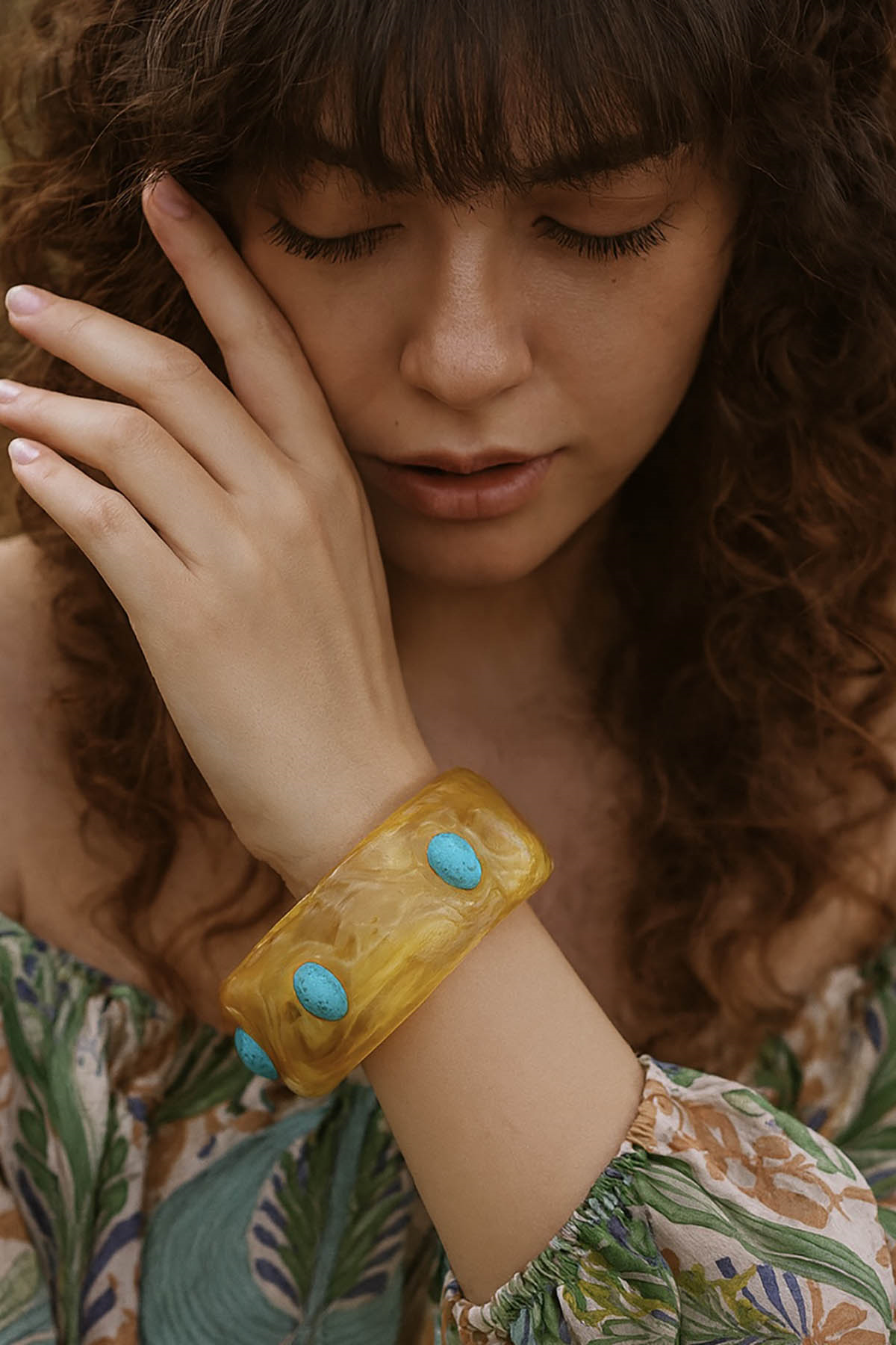 Kahverengi Ve Mavi Renk Taş Detaylı Kalın Kemik Mika Bileklik