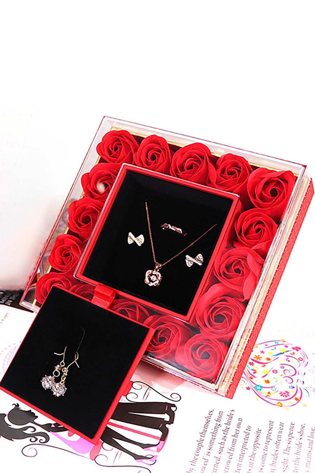 Aşkı ve zarafeti bir arada sunan bu özel hediye kutusu, sevdiklerinize unutulmaz bir sürpriz yapmak için tasarlandı. Kırmızı saten kurdeleyle süslenmiş kutunun kapağında kalp şeklinde pencere ve altın yaldızlı yazı detayları bulunur. İç kısmında yapay güller ve takı yerleştirilebilecek özel bir bölme yer almaktadır. Kutunun sağ bölümünde 9 adet canlı kırmızı yapay gül yer alırken, sol kısmı kolye, bileklik veya yüzük gibi takılar için ayrılmıştır.
