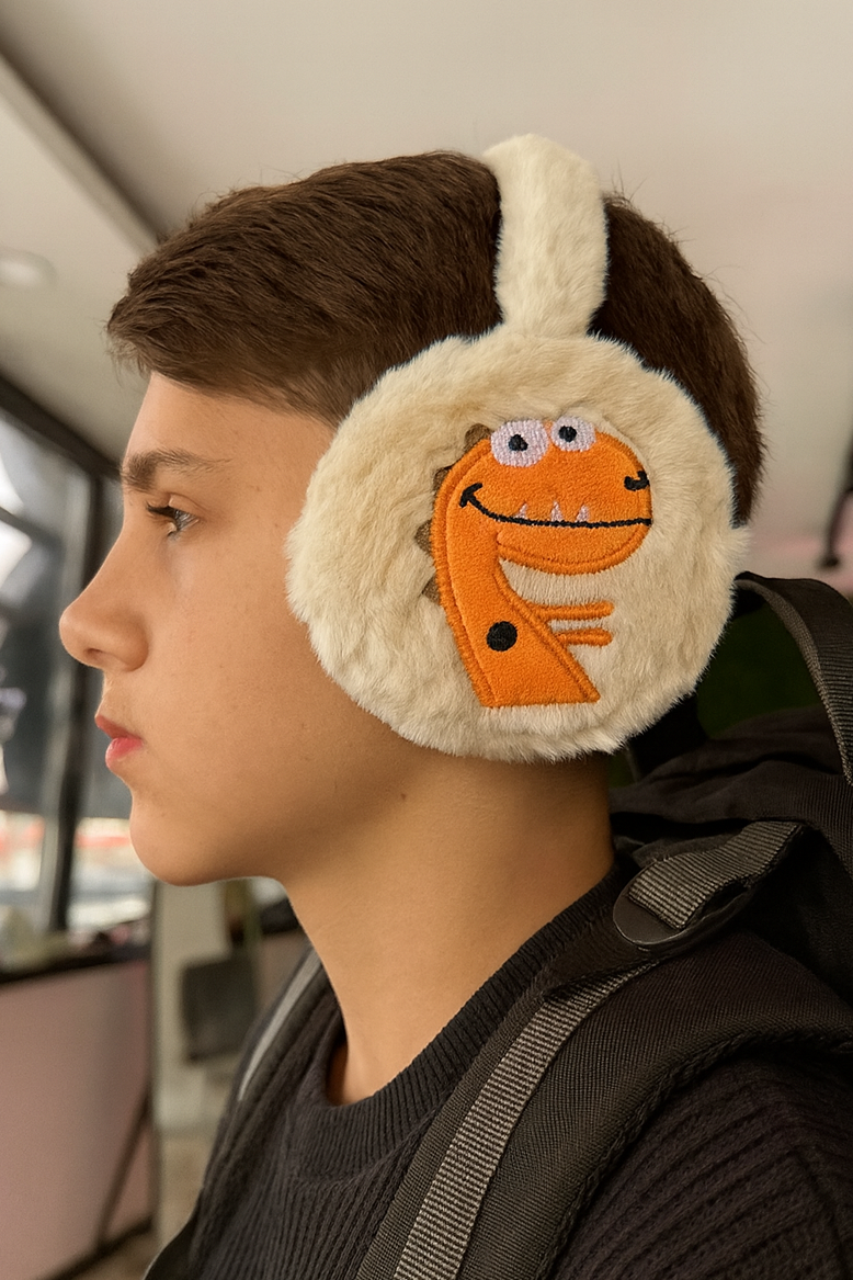 Krem Renk Dinazor Figürlü Peluş Erkek Çocuk Kulaklık