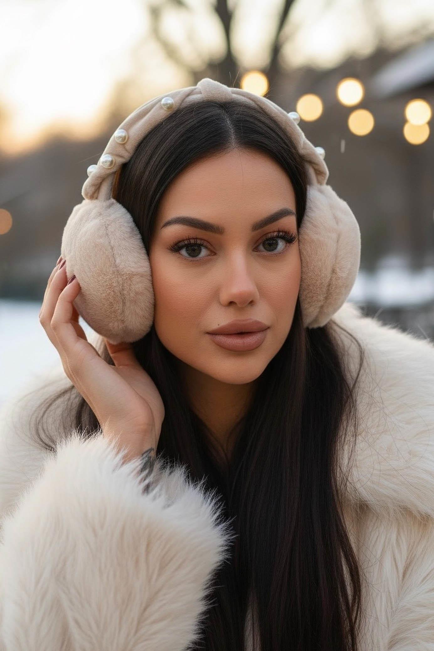 Krem Renk İnci Detaylı Peluş Kulaklık