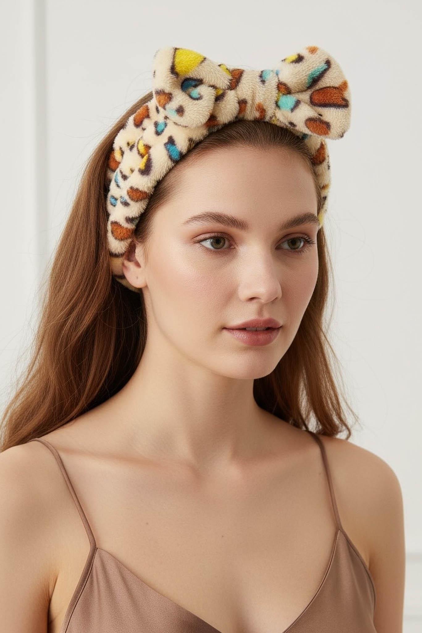 Krem Renk Leopar Figürlü Peluş Saç Bandı