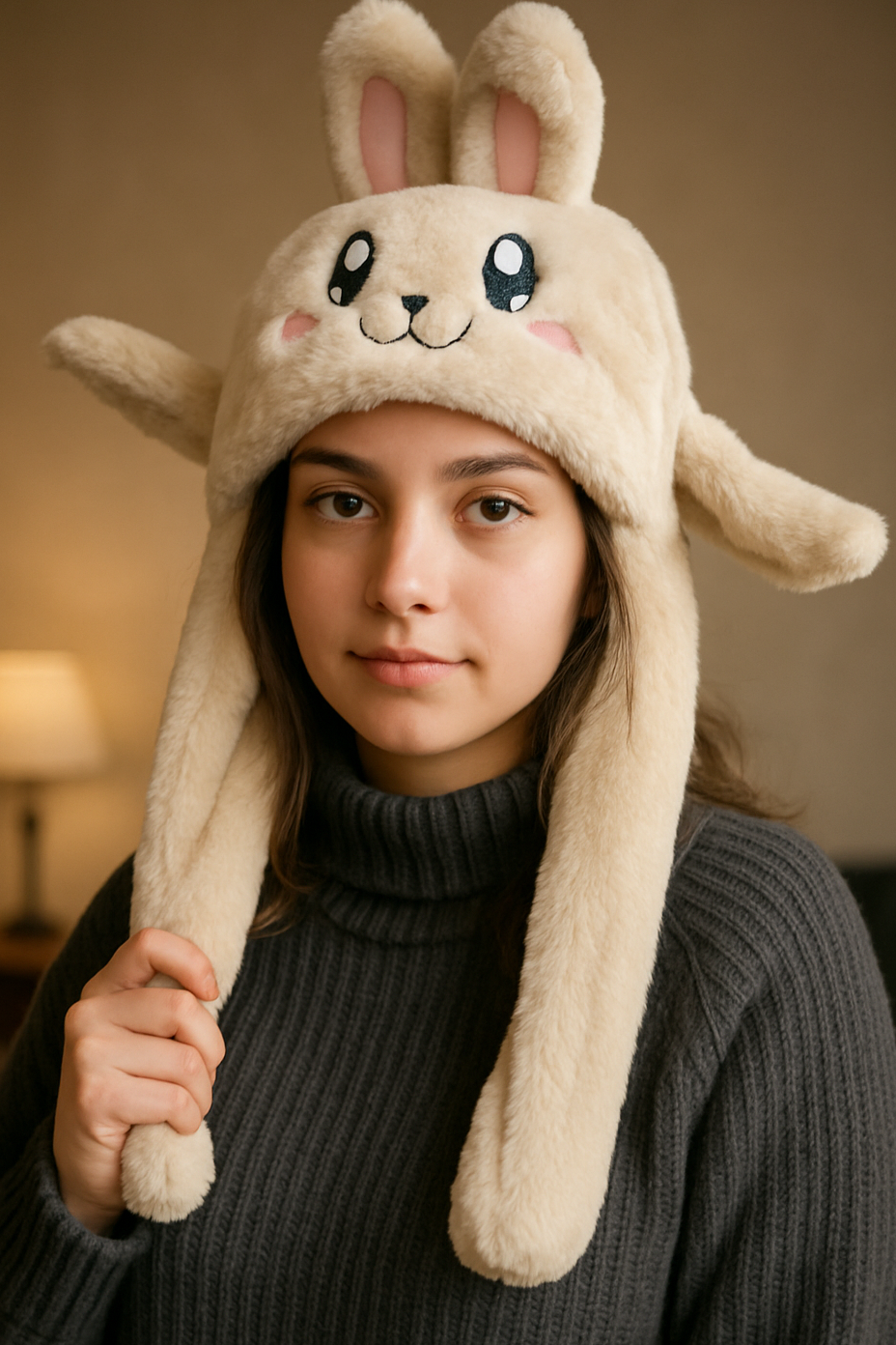 Krem Renk Tavşan Figürlü Kulakları Oynayan Peluş Şapka