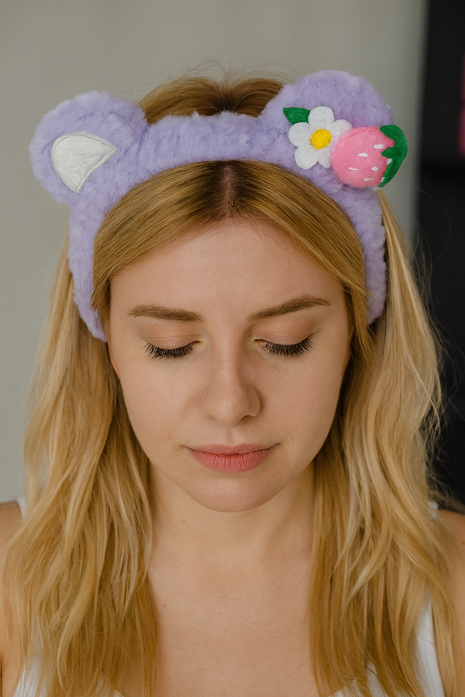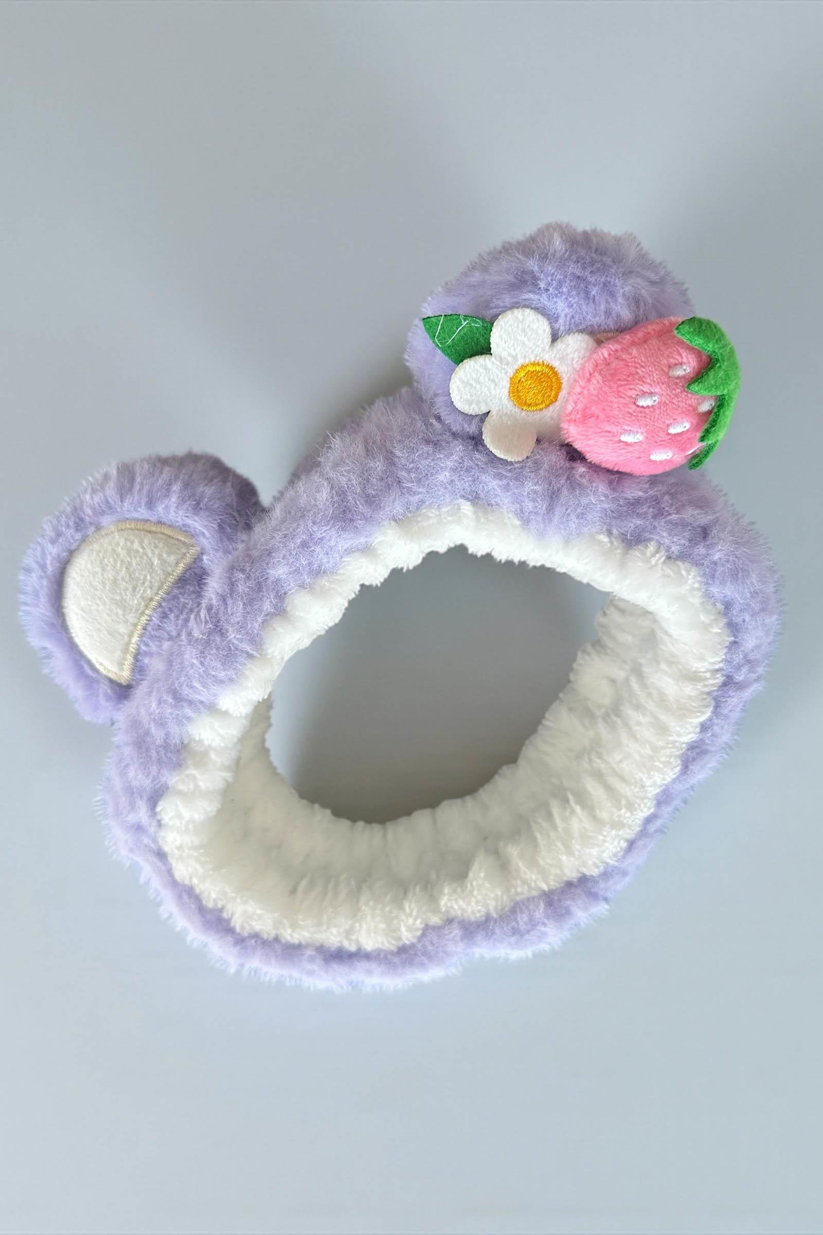 Lila Renk Çiçek Ve Çilek Figürlü Kulak Detaylı Peluş Saç Bandı