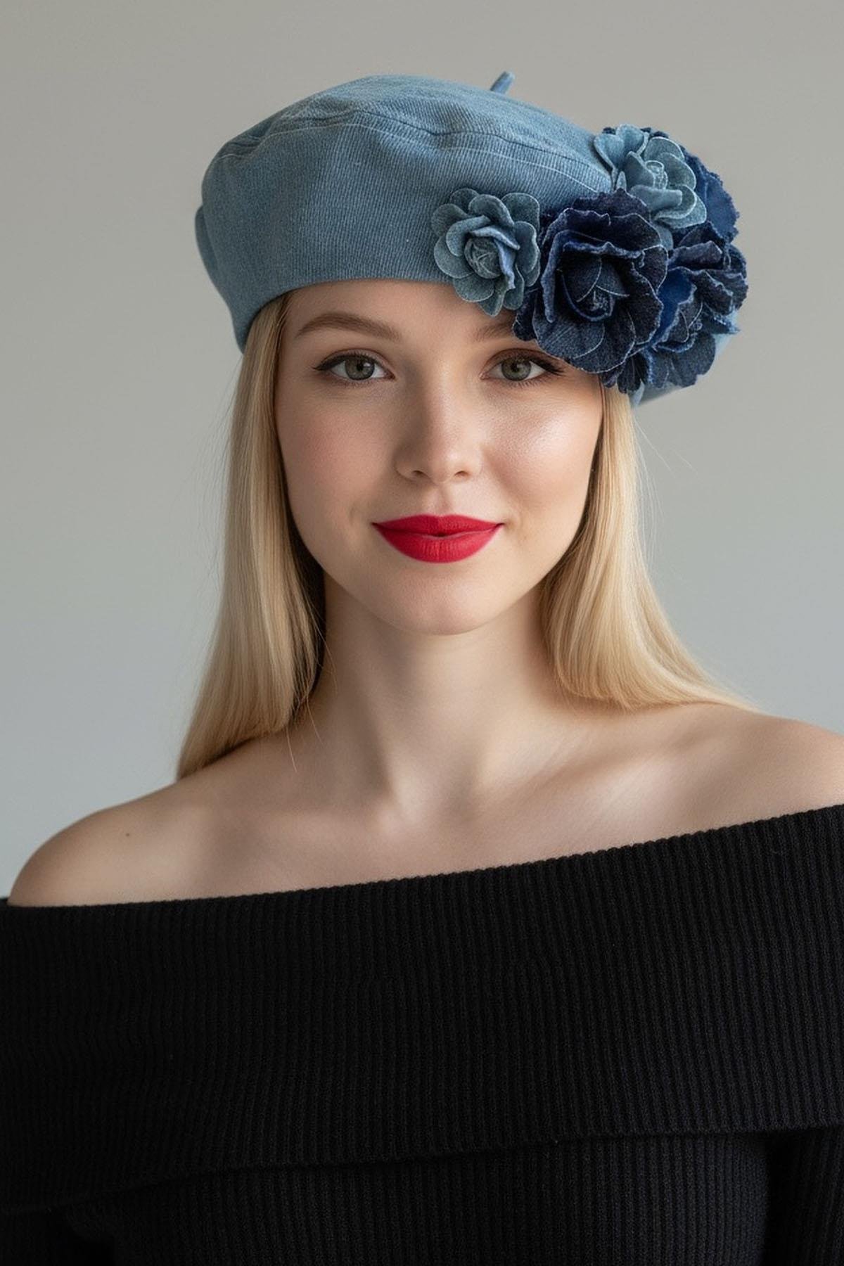 Mavi Renk Çiçek Figürlü Kot Tasarım Şapka
