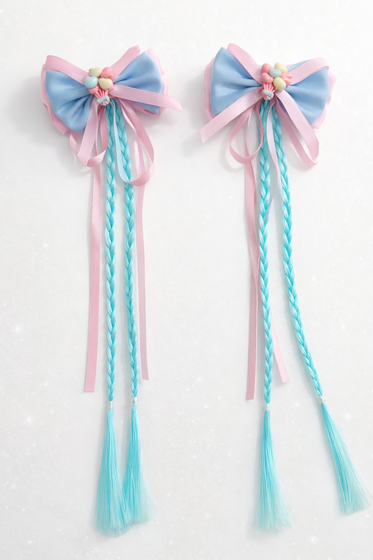 Saç stilinize zarif ve eğlenceli bir dokunuş katmak için tasarlanan bu fiyonk detaylı toka, şık görünümüyle öne çıkar. Pastel tonlardaki kurdeleleri, örgü detayları ve uçlarındaki püskülleriyle hem günlük kullanıma hem de özel günlere uyum sağlar.