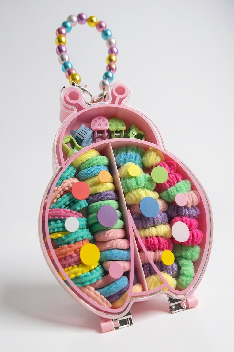 Miniklere özel hazırlanan bu renkli çocuk tokası seti, sevimli çanta tasarımıyla hem kullanışlı hem de eğlenceli! Şeffaf Uğur Böceği formundaki mini çantanın içinde, yumuşak dokulu ve saçlara zarar vermeyen çoklu renkli mini lastik tokalar bulunur.