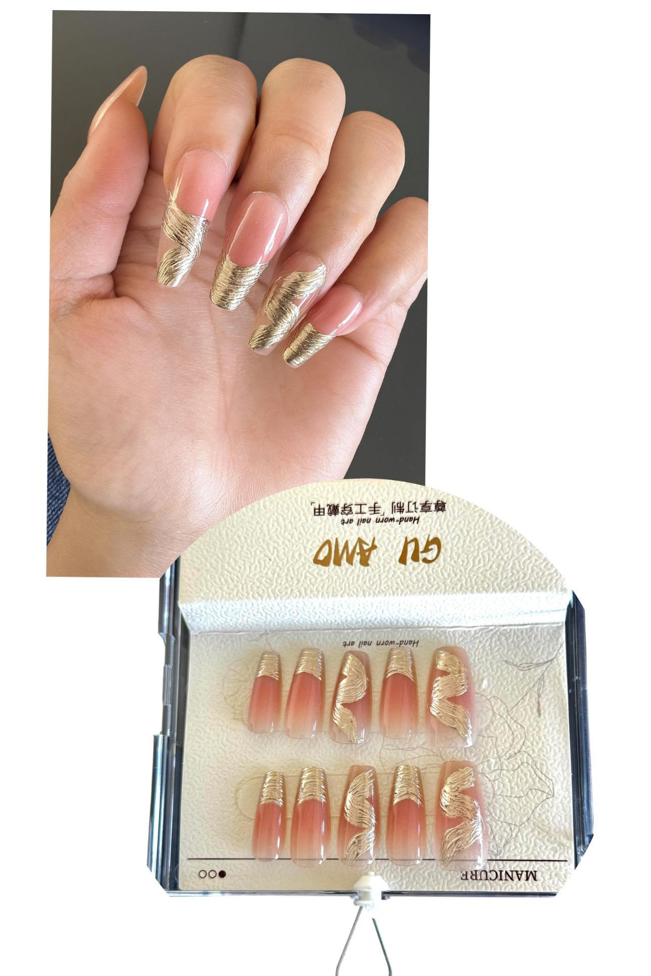 Pembe Ve Altın Renk Jel Tırnak Görünümlü 10'lu Takma Tınak Set (Yapıştırıcılı)