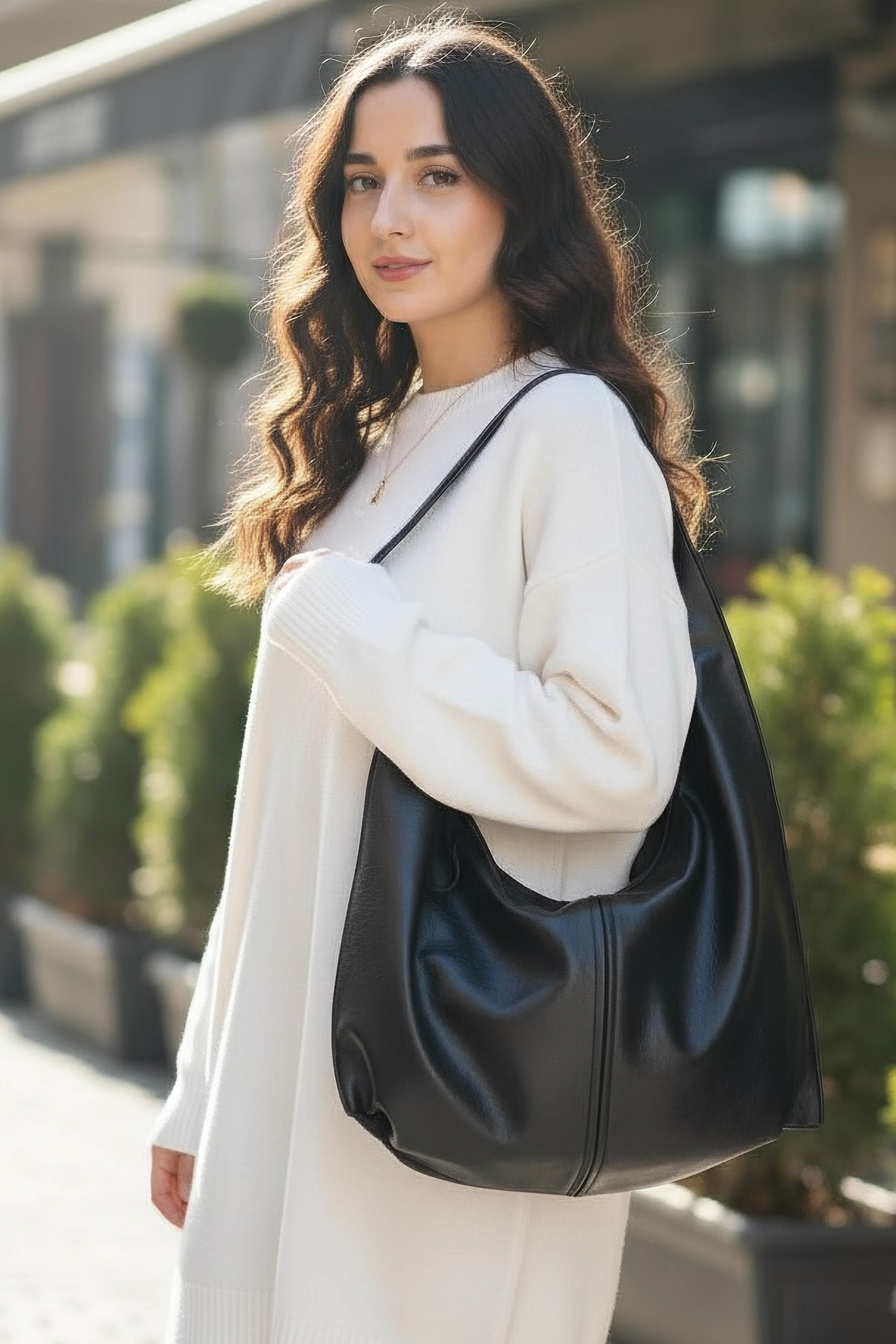 Siyah Renk Büyük Boy Deri Kadın Çanta