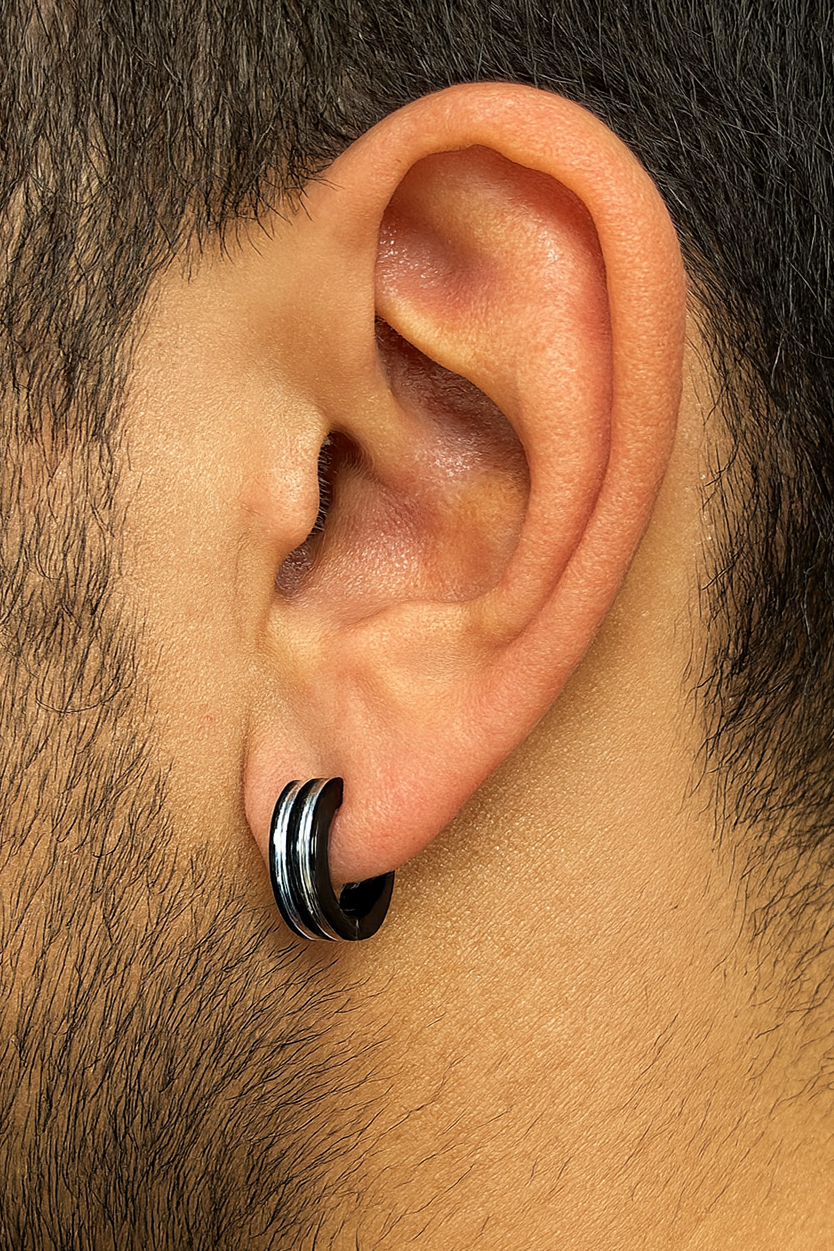 Siyah Renk Çizgi Detaylı Erkek Çelik Küpe (Çift)