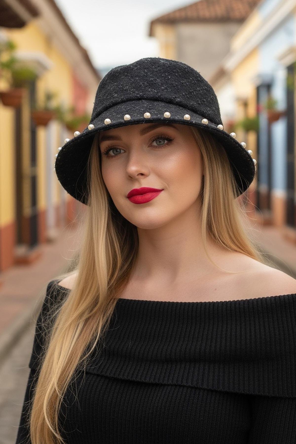 Siyah Renk İnci Detaylı Kot Tasarım Şapka