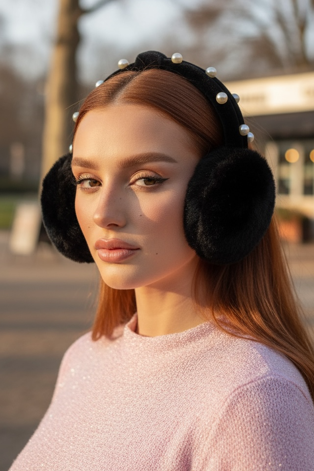 Siyah Renk İnci Detaylı Peluş Kulaklık