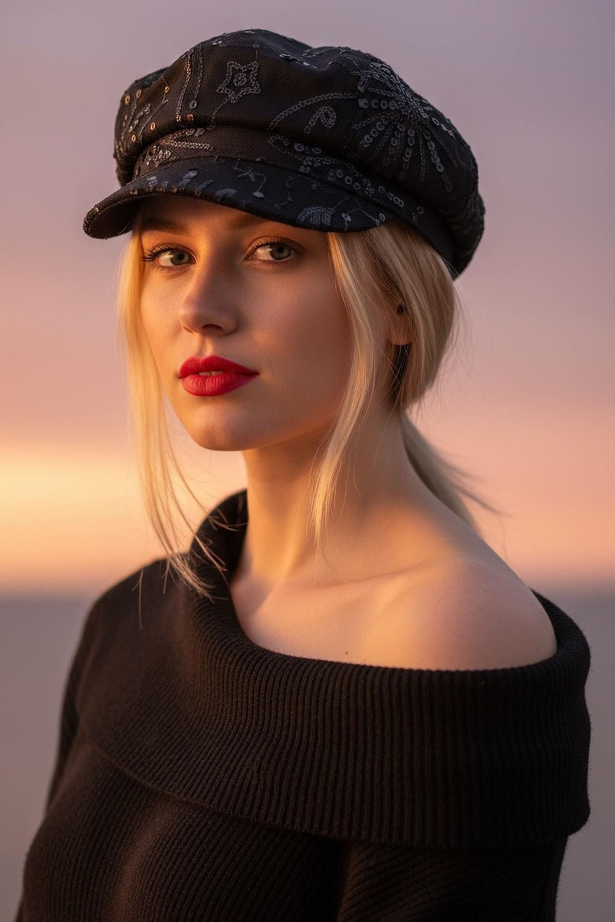 Siyah Renk Pul Detaylı Tasarım Şapka