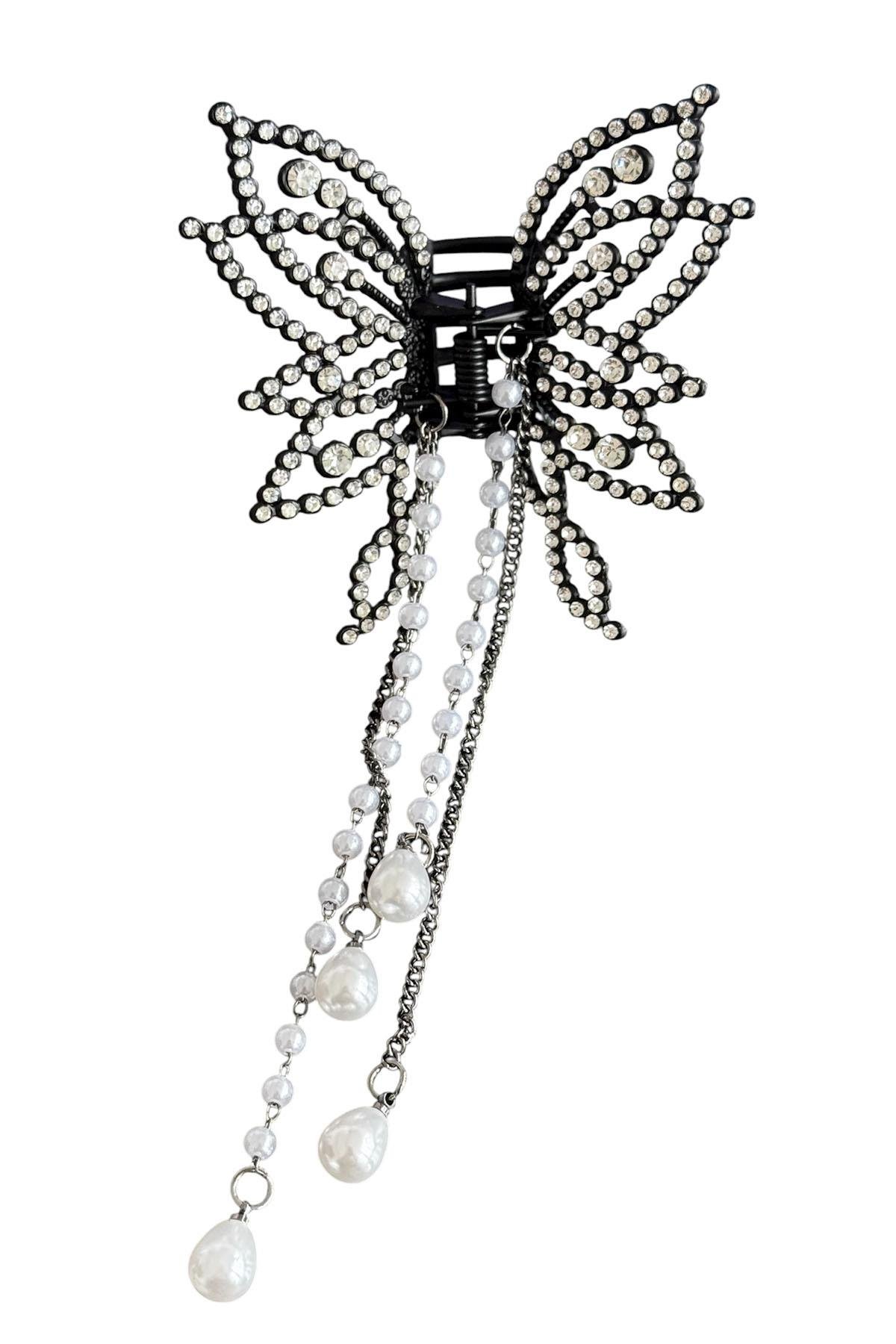 Siyah Renk Taş Ve İnci Detaylı Kelebek Figürlü Sallantılı Mandal Toka