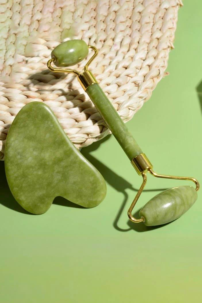 Yeşil Renk Doğal Taş Gua Sha ve Roller Yüz Masaj Taşı Seti