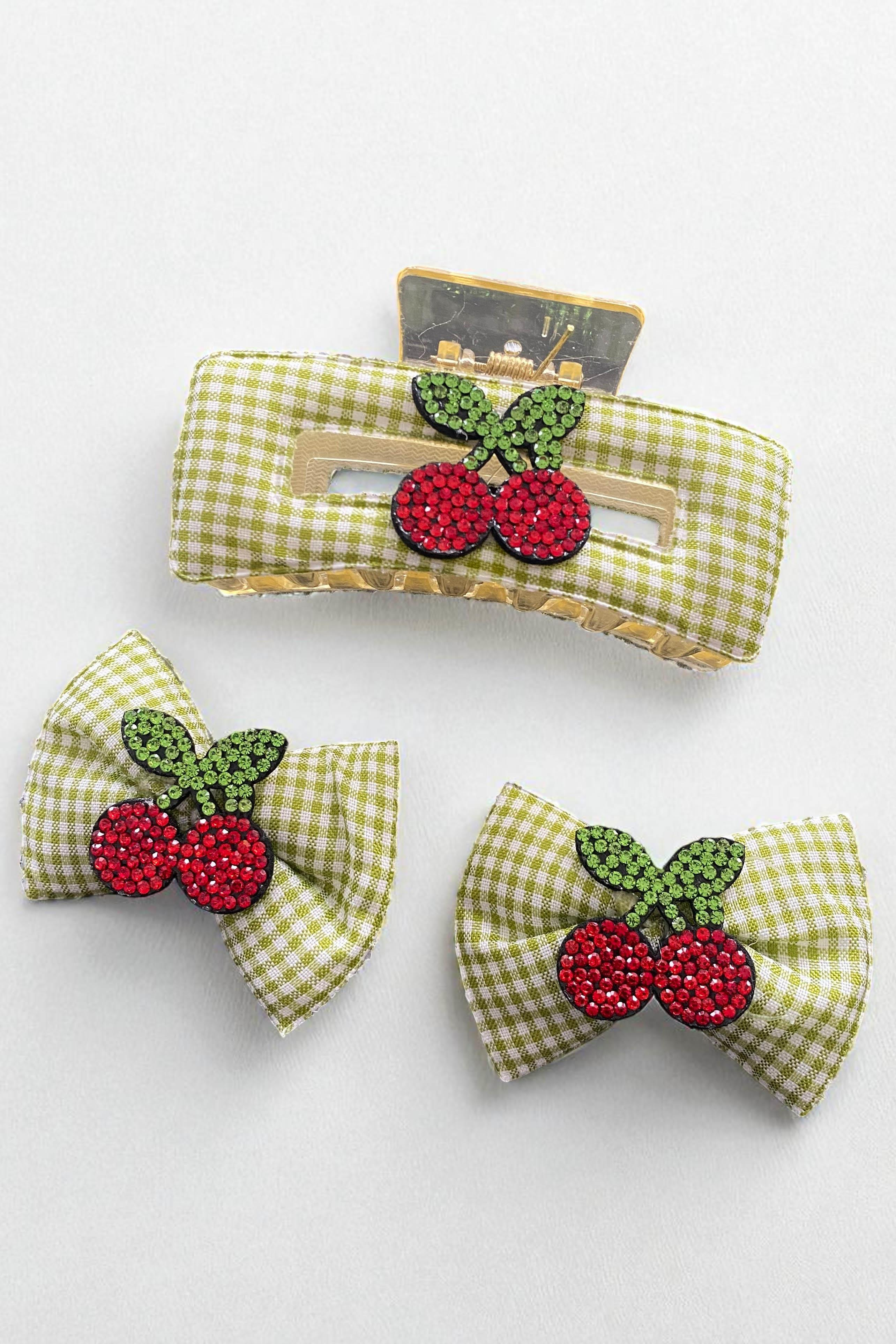 Yeşil Renk Kiraz Figürlü Potikare Desenli Yan Toka Ve Mandal Toka Set